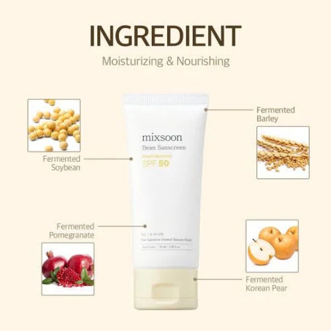 Protege tu piel cada día con el mixsoon Bean Sunscreen, un protector solar coreano de textura ligera que combina filtros UV de amplio espectro SPF50+ PA++++ con ingredientes calmantes y antioxidantes derivados de la fermentación de soya (bean extract).